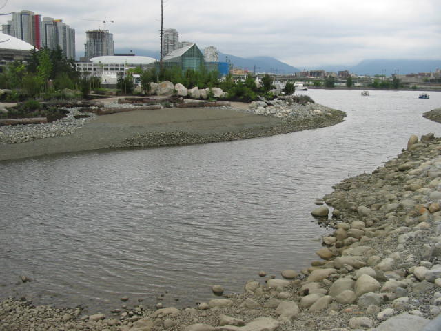 Below, a public walkway on the south side of False Creek. Cambie St. Bridge in the background.