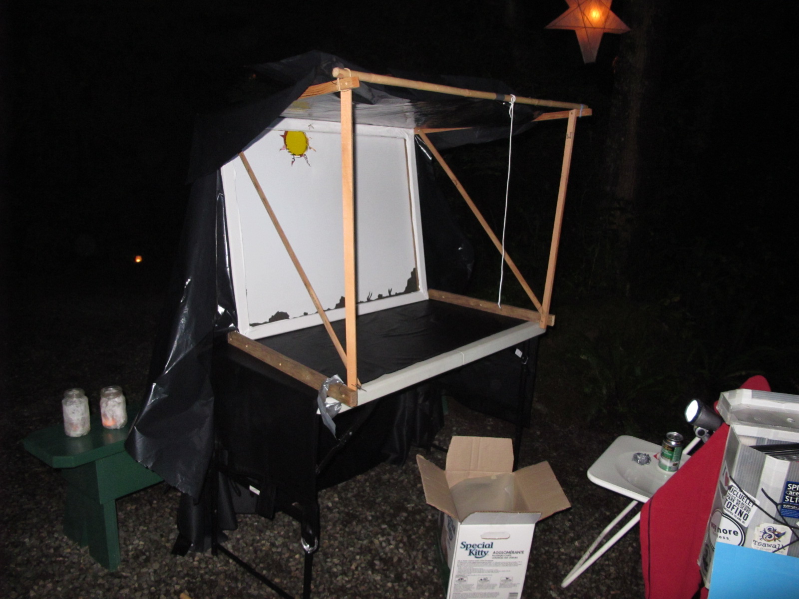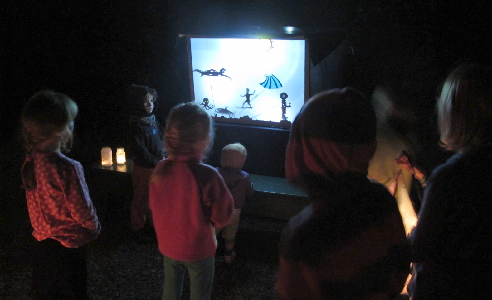 Fortunately the day was clear, the rain held off, and the event went ahead full steam. With my friend Dolores’s indispensable (and also last-minute) help, we literally haywired and duct-taped the stage and screen together for the first time in fading light, while a hopeful audience of kids stood waiting. Once set up, we adjusted our lights — two bike lights and a flashlight (no power for our outdoor-in-the-woods venue). Then we sat down and, first time for both of us, placed shadow-puppet to screen. The show had begun.
