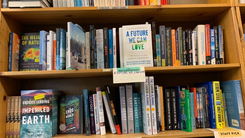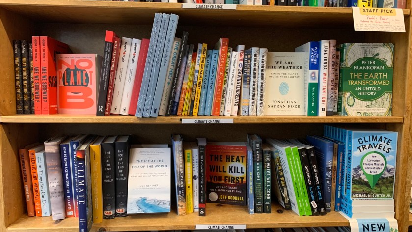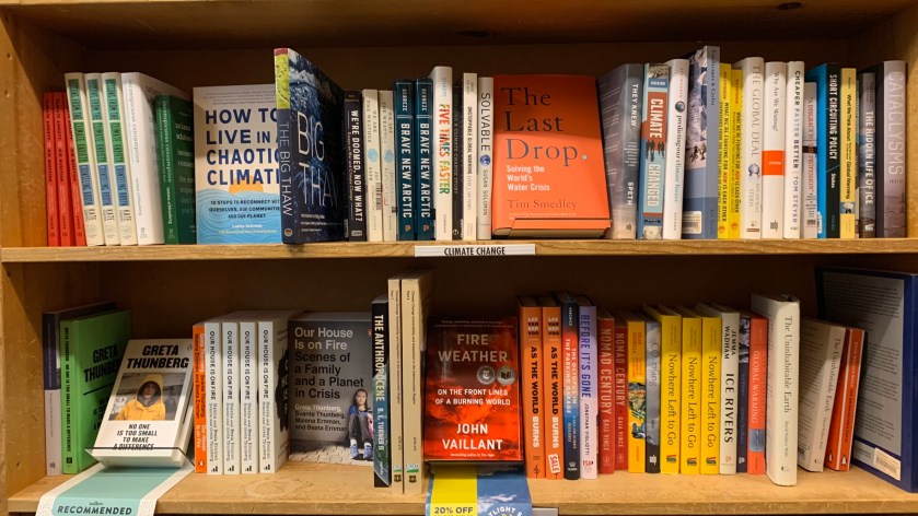 Of course we visited the legendary Powell’s Books. Which leads to the point of this post. Here are the full 12 shelves of Powell’s “climate” section, presented for future reference as a rough literature review of the subject up till July 2024. Click to enlarge so you can (I hope) read the titles on the spine.