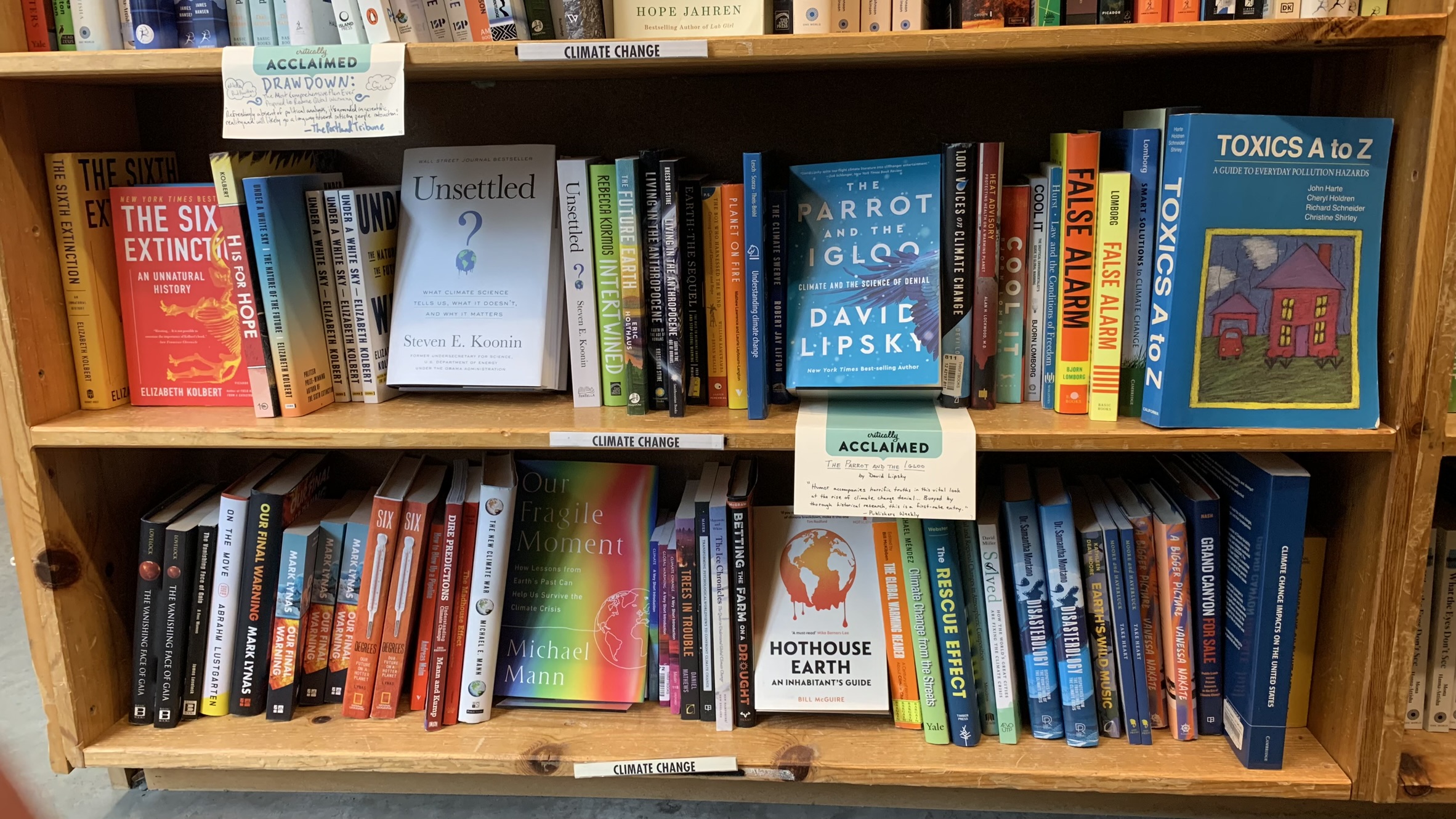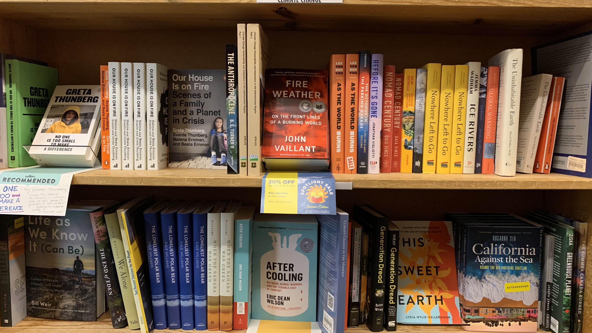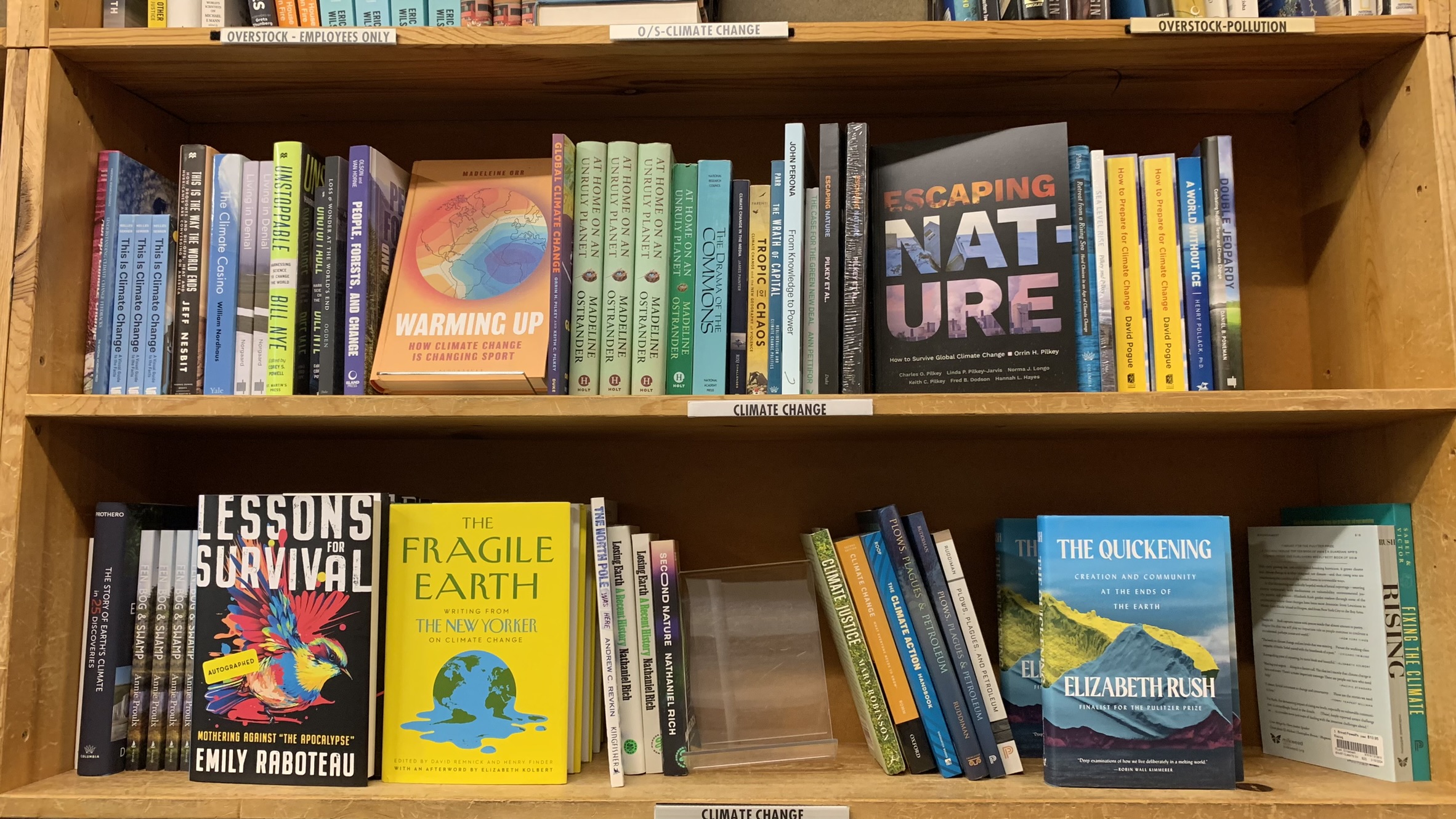 Of course we visited the legendary Powell’s Books. Which leads to the point of this post. Here are the full 12 shelves of Powell’s “climate” section, presented for future reference as a rough literature review of the subject up till July 2024. Click to enlarge so you can (I hope) read the titles on the spine.