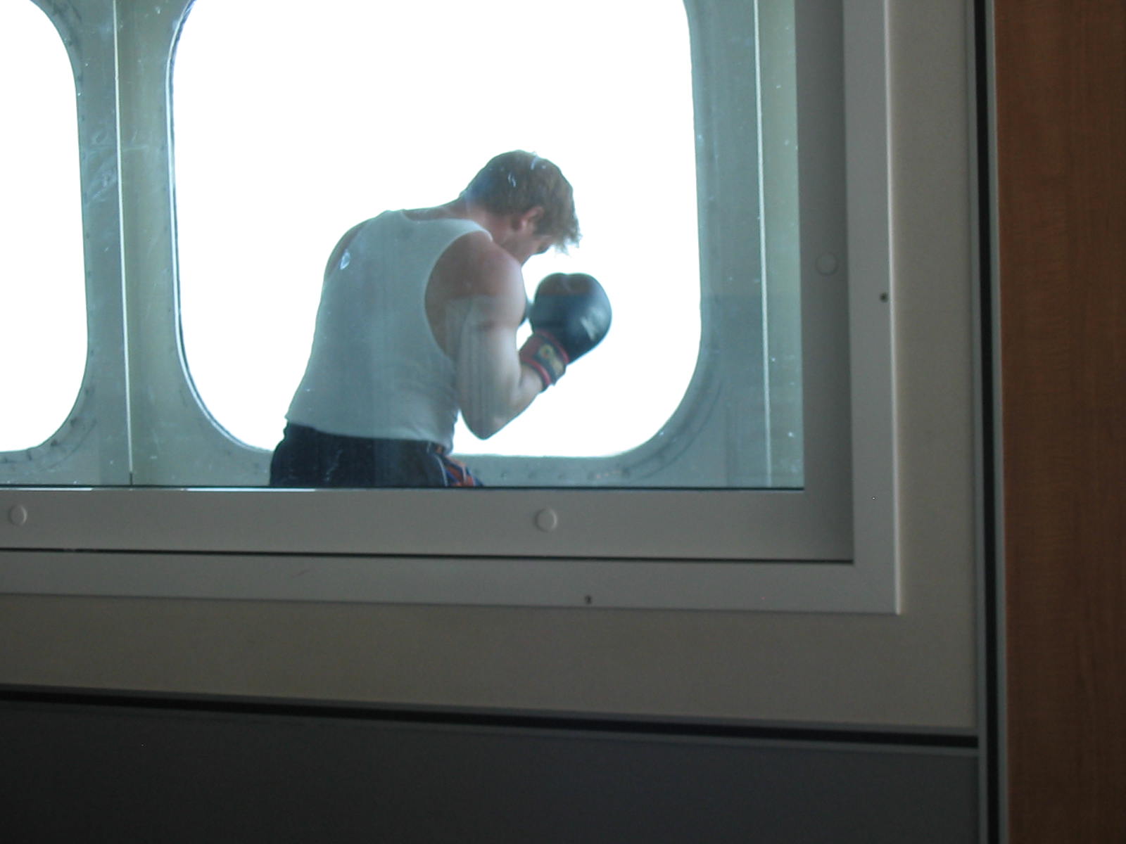 To my left, on the outer deck, a man in a “wifebeater” undershirt and boxing gloves hammers one of the steel pillars. I take a clandestine picture, thinking, “I’m not in Kansas anymore, am I?”